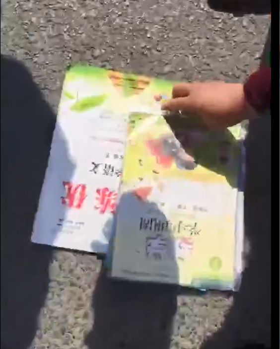 视频中,一个男孩受伤倒在路中,身边不远处散落着两本书,有目击者看到上写刘某某。