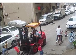 之后悲剧发生了:一个身穿黄色上衣的小男孩失去平衡,从叉臂上摔了下来,直接被叉车前轮碾压,还被拖行了一小段距离。