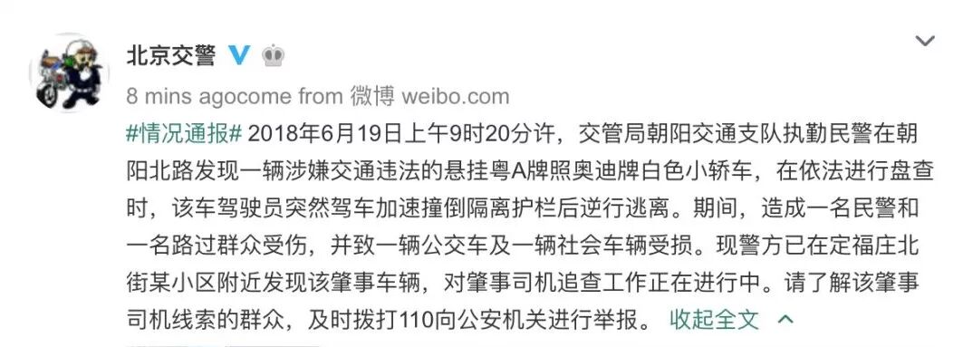 北京警方全城征询肇事司机线索!朝阳大悦城附近一外地牌照奥迪车撞交警闯卡逃逸!