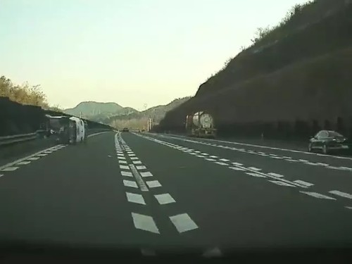 从行车记录视频来看,当时车主驾车行驶在最左侧车道,正常行驶下前方出现一辆侧翻的事故车,事故车辆占据近1/3车道。当与事故车还有一定距离时,车主似乎并未看见前方出现的突发情况,继续高速行驶。当距离越来越近时,车主突然大幅度转动方向盘,采取紧急变道的方式避免了一次追尾事故。