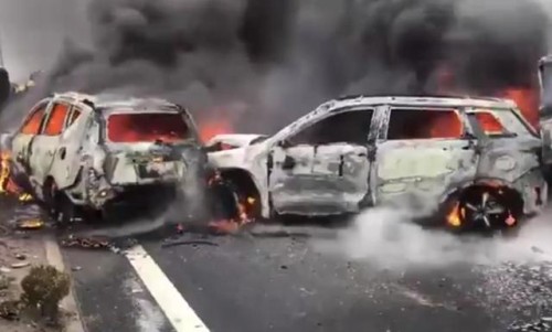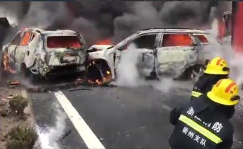 据悉,2019年12月31日11时36分左右,浙江省G60往江西方向距离衢州西2.5公里处多车连撞,3辆小车、1辆货车着火,消防员兵分多路展开救援:警戒组与路政人员负责现场警戒,防止发生二次伤害;救援一组出3支水枪利用泡沫对4辆车火势进行打压,同时二组利用绝缘剪剪开车厢门,利用挠钩清理出货车上的物品,进行覆盖灭火。经过半个小时左右救援,明火被扑灭,无人员被困。据消防员初步了解,货车上拉的是布料,而其中一辆小车是回家过年的,车上的行李箱和新衣服均被烧光。
