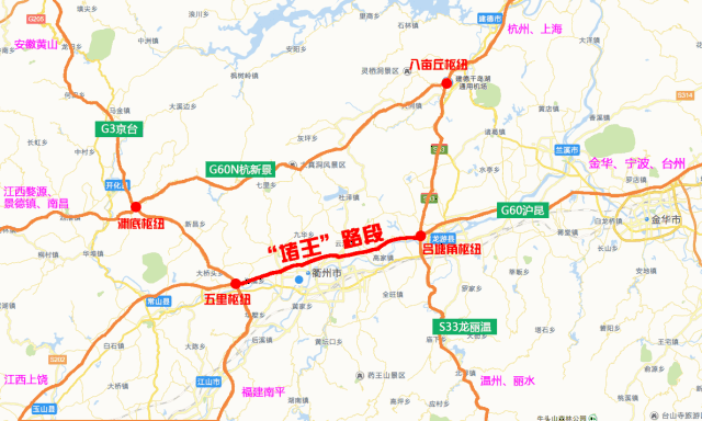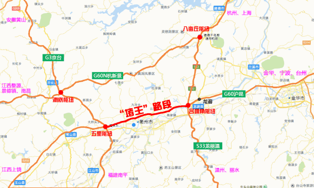 前往江西、福建、安徽方向的,在吕塘角枢纽转S33龙丽温高速往杭州方向行驶——八亩丘枢纽转G60N杭新景高速往江西方向行驶——渊底枢纽处根据路标提示继续沿G60N杭新景高速或转G3京台高速。