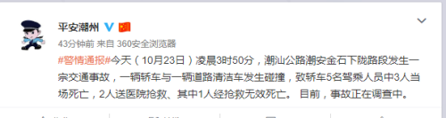 #警情通报#今天(10月23日)凌晨3时50分,潮汕公路潮安金石下陇路段发生一宗交通事故,一辆轿车与一辆道路清洁车发生碰撞,致轿车5名驾乘人员中3人当场死亡,2人送医院抢救、其中1人经抢救无效死亡。 目前,事故正在调查中。