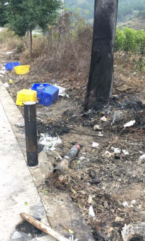 10时30分许,来自辽宁丹东的货车司机邵明学,正在路旁的连州市湖江三友果业公司果场内等待收果,忽然他听到外面传来一声巨响,随即跑出去,看到一辆面包车撞停在一棵树前,冒出浓烟;公路旁,还有一辆三轮摩托车。