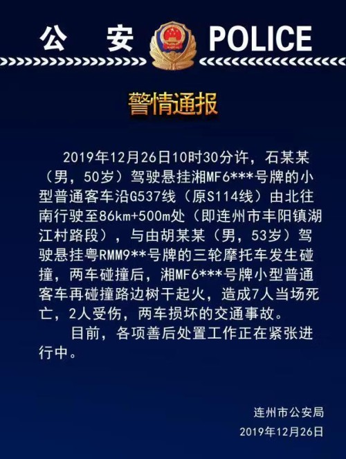 连州市公安局12月26日傍晚发布警情通报称:12月26日上午10时30分许,石某某(男,50岁)驾驶湘MF6×××号牌的小型普通客车沿G537线(原S114线)由北往南行驶至连州市丰阳镇湖江村路段时,与由胡某某(男,53岁)驾驶的粤号牌三轮摩托车发生碰撞,两车碰撞后,湘MF6×××号牌小型普通客车再碰撞路边树干起火,造成7人当场死亡,2人受伤,两车损坏的交通事故。目前各项善后处置工作正在紧张进行中。