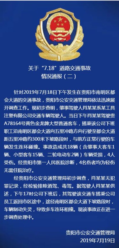 针对2019年7月18日下午发生在贵阳市南明区都会大道的交通事故,贵阳市公安交通管理局依法迅速展开调查工作。现初步查明,肇事驾驶人肖某某系某工具注塑有限公司交通车辆驾驶人。当日下午肖某某驾驶贵A78164号黄色金龙牌大型普通客车,搭乘该公司下班职工沿南明区都会大道向五里冲路方向行驶至都会大道距五里冲路约300米下坡路段时,与前方正常行驶的车辆发生连环碰撞。事故造成共18辆(含肇事大客车1辆、小型客车15辆、二轮电动车2辆)车辆受损,4人受伤。经贵阳市第一人民医院诊断,4名伤者均为轻伤无需住院治疗。