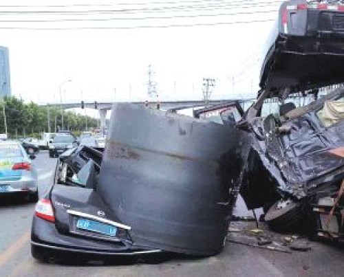 一辆载有成卷钢板的大货车行驶时突然刹车,车厢内的钢板疾速冲向前,将驾驶室撞瘪后,滚落车下时又砸扁一辆同方向的轿车,事故造成该路段出现大面积压车现象。