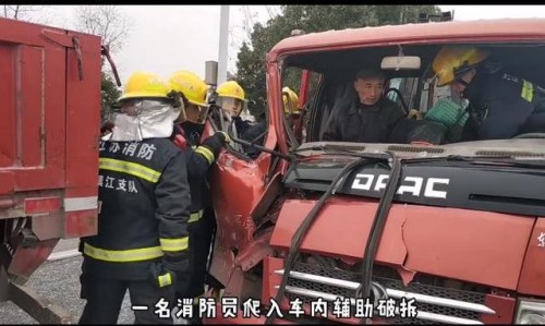 接到最新消息,在1月1日上午,江苏省镇江市一处高速收费出口发生一起严重交通事故,两辆大货车追尾,由于撞击猛烈,后车的车头严重变形,驾驶室的乘客被困动弹不得,情况非常危急。当地交警、消防和120急救中心等部门接到报警电话之后,第一时间奔赴现场进行救援。具体当时现场的情况如何?下面小编就带着大家一起过去看看。