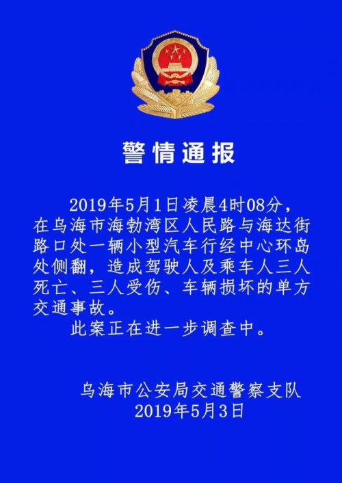 5月3日,北京青年报记者从内蒙古自治区乌海市公安局交通警察支队获悉,2019年5月1日凌晨4时08分,在乌海市海勃湾区人民路与海达街路口处一辆小型汽车行经中心环岛处侧翻,造成驾驶人及乘车人三人死亡、三人受伤、车辆损坏的单方交通事故。