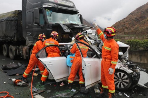 现场图片显示,一处山脚下的公路上,一辆白色轿车车头部分受到撞击严重变形,司机驾驶室被引擎盖和车顶挤压得没有空间。另一张现场图片显示,白色小轿车的尾部被一辆半挂货车撞击,多名消防员正在拿着破拆机器实施救援。