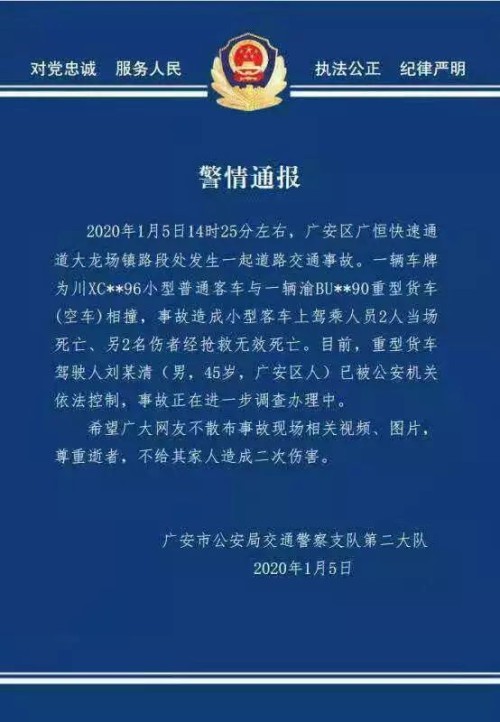 同样在今天,广安交警发布警情通报称,2020年1月5日14时25分左右,广安区广恒快速通道大龙场镇路段处发生一起道路交通事故。一辆车牌为川XC**96小型普通客车与一辆渝BU**90重型货车(空车)相撞,事故造成小型客车上驾乘人员2人当场死亡、另2名伤者经抢救无效死亡。目前,重型货车驾驶人刘某清(男,45岁,广安区人)已被公安机关依法控制,事故正在进一步调查办理中。