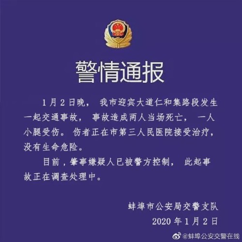 1月2日晚,我市迎宾大道仁和集路段发生一起交通事故,事故造成两人当场死亡,一人小腿受伤。伤者正在市第三人民医院接受治疗,没有生命危险。目前,肇事嫌疑人已被警方控制,此起事故正在调查处理中。