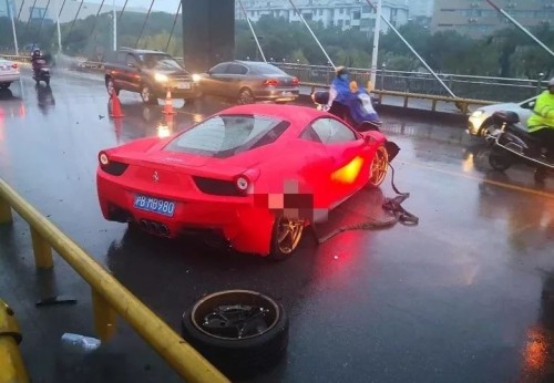 网友爆料:昨晚,嘉兴勤俭大桥上发生一起车祸....一辆上海牌照的红色法拉利跑车撞了,轮子都 掉了!这车祸有点贵,看这法拉利的车头基本算是废了吧?