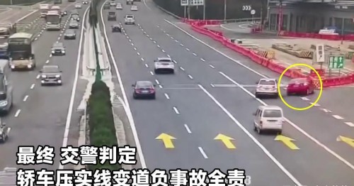 据悉,事发在2020年1月18日下午16点38分左右,事发地点位于G60沪昆高速沪杭段(沪杭高速公路)上海方向嘉善出口,从监控画面可以看到,一辆白色小车在行驶时忽然减速,并压实线变道,后方红色马自达小车驾驶员见状避让不及,赶紧向右打方向,由此车辆失控,撞上了路边水码,事故造成马自达小车受损严重,20多个水码被撞得残破不堪,现场一片狼藉,嘉善高速交警到场后,通过对监控视频的调阅,确认是白色小车压实线变道导致的,故而由其承担事故全部责任,红色马自达小车司机无责任。
