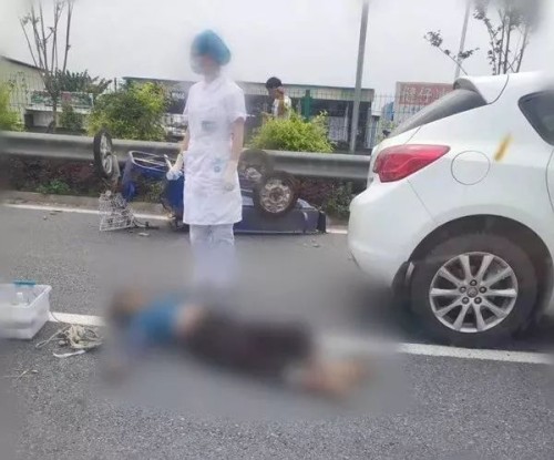 从网友提供的现场照片可以见到,一辆三轮车被撞翻在地,事故中的白色小车右侧车头损毁严重,在小车旁边躺着一名年纪较大的女子,医护人员正在进行紧急抢救工作,相关部门也已经在现场处理。