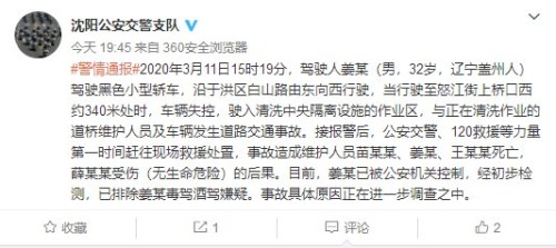 2020年3月11日15时19分,驾驶人姜某(男,32岁,辽宁盖州人)驾驶黑色小型轿车,沿于洪区白山路由东向西行驶,当行驶至怒江街上桥口西约340米处时,车辆失控,驶入清洗中央隔离设施的作业区,与正在清洗作业的道桥维护人员及车辆发生道路交通事故。接报警后,公安交警、120救援等力量第一时间赶往现场救援处置,事故造成维护人员苗某某、姜某、王某某死亡,薛某某受伤(无生命危险)的后果。目前,姜某已被公安机关控制,经初步检测,已排除姜某毒驾酒驾嫌疑。事故具体原因正在进一步调查之中。