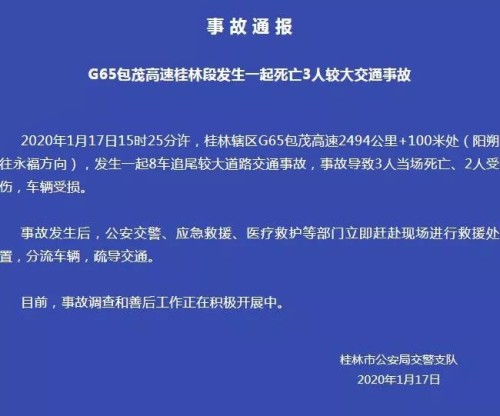 桂林市公安局交警支队之后也发布通报:2020年1月17日15时25分许,桂林辖区G65包茂高速2494公里+100米处(阳朔往永福方向),发生一起8车追尾较大道路交通事故,事故导致3人当场死亡、2人受伤,车辆受损。