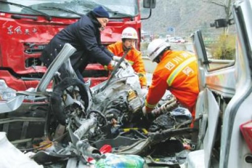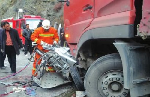 惨烈车祸 面包车占道行驶对撞货车 消防破拆车门车顶救人(组图)